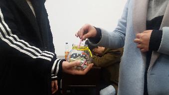 接下来,辣条、泡泡糖、干脆面等等这些出没在小学门口小卖部的“童食”又再一次回到同学们的手中。会前生活委员陈娟向同学们搜集儿时常吃零食,会上分发给大家。很快零食就被瓜分干净,一时间欢声笑语伴着嘎吱的咀嚼声,同学们一方面回味自己的旧时宝贝,一方面又品味其他人的童年最爱。
