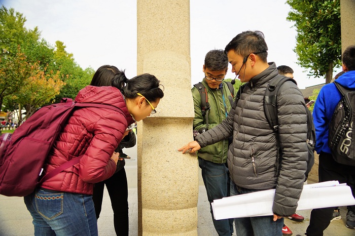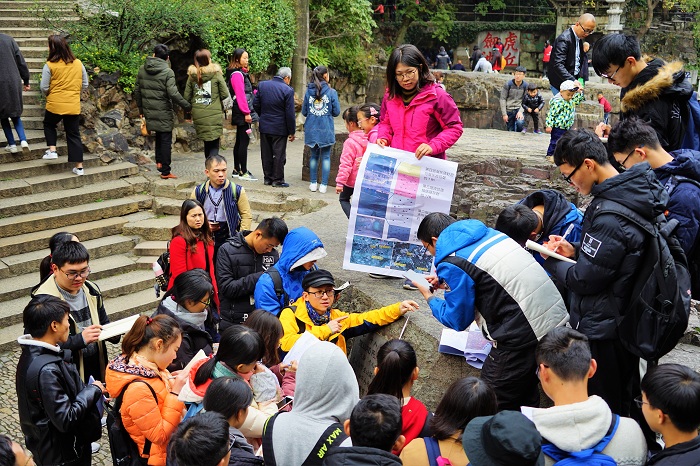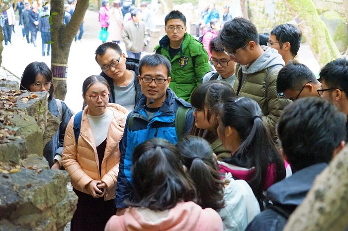 在虎丘认识实习结束后,师生们稍作休息后立马乘车前往本次苏州地质认识实习的另一地点天平山花岗岩出露区。老师们首先向同学们讲述了花岗岩的形成机理和特点,以及后期的风化作用现象。沿途登山过程中,同学们观看到诸如“一线天”或球状岩石等自然景观,更为直观地了解了花岗岩节理风化和球形风化现象。下午17:00,全体师生顺利完成了本次苏州地质认识实习并乘车返回南京。通过此次苏州地质认识实习,同学们将课堂上学习到的专业知识和实践紧密地结合起来。在和老师的互动交流中,同学们初步了解了地质野外工作的基本情况和注意事项。众多同学表示此次实习活动令他们受益良多,为以后的专业学习打下良好的基础。