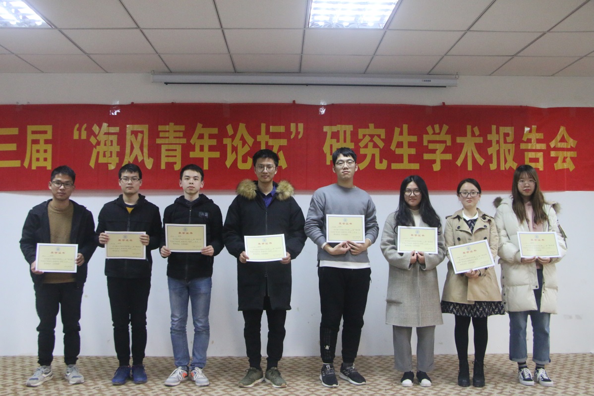 “海风青年论坛”以服务研究生学术、科学研究为宗旨,鼓励同学们将个人参与的科研项目和科学研究情况予以汇报和分享交流。作为一个展示自我、锻炼自我、完善自我的平台,本次学术报告会吸引了来自学院不同专业研究生同学的积极参与。在汇报过程中,同学们思路清晰、语言流畅,每位同学的讲解都各有千秋,异彩纷呈,得到了评委老师的肯定。同时,评委老师从报告内容、PPT制作、创新度等多方面进行了中肯地点评,对每位参赛同学在科研中遇到的问题,给予了宝贵的意见和建议。