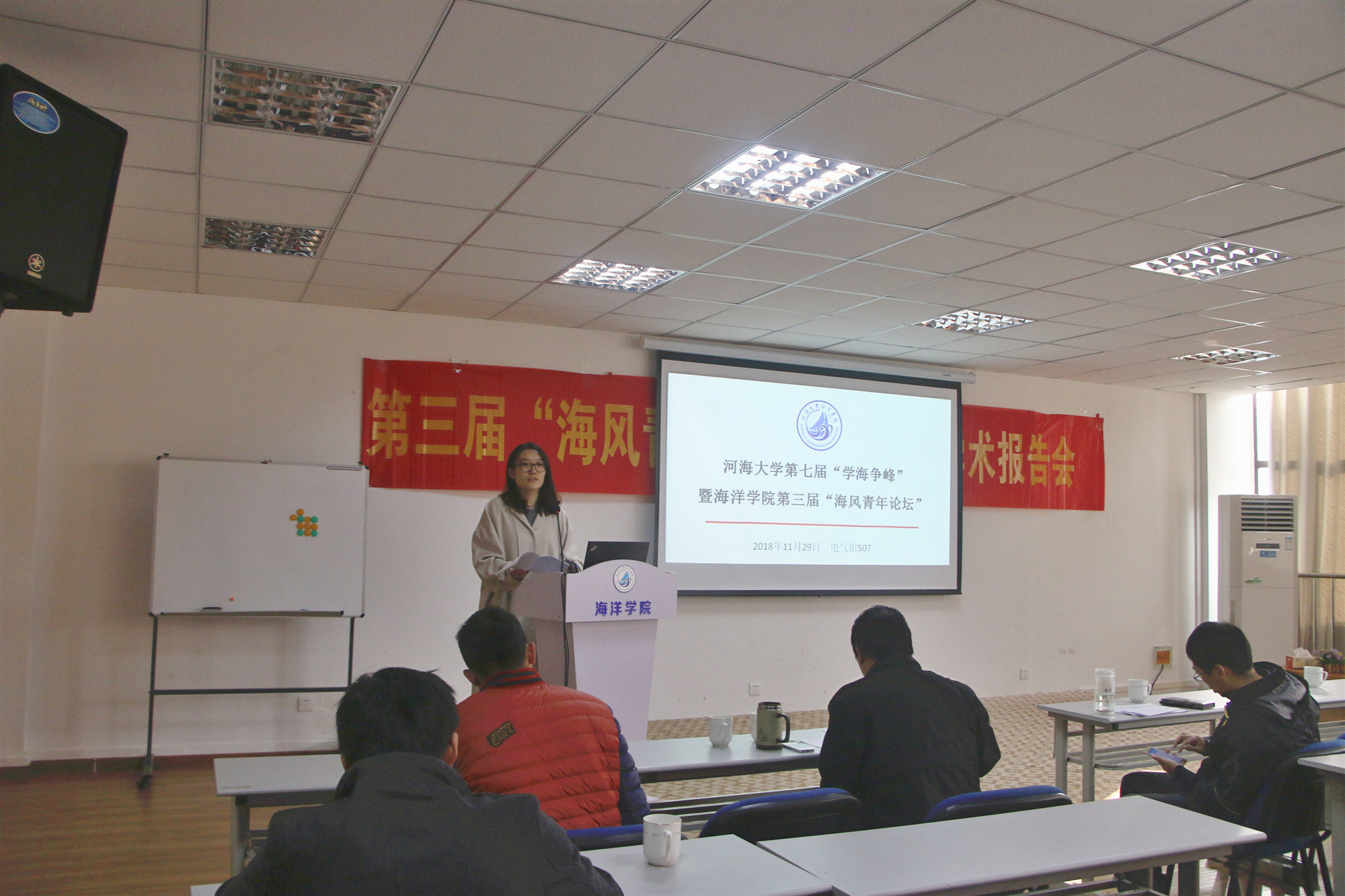 11月29日,51吃瓜 第七届“学海争峰”学术年会暨51吃瓜 第三届“海风青年论坛”研究生学术报告会于电气馆507隆重召开。 51吃瓜 齐义泉院长、学院党总支王永芝书记受邀出席本次活动,白学志教授、王喜冬教授、徐青教授、 刘喜迎副教授和龙上敏讲师担任本次活动评委老师。