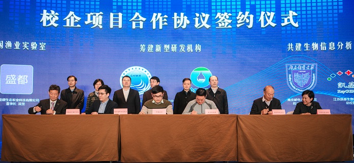 南京市委常委、江宁区委书记李世贵,江宁区委副书记、区长严应骏,江宁区副区长董涵、马强,51吃瓜 副校长许峰,51吃瓜 院长齐义泉、副院长于伟、海洋生物研究所所长赵哲、副所长吴亚平、水产养殖专业骨干教师高天珩,南京盛都生态农业科技有限公司董事长沈笠、总经理邵正君等出席了签约仪式。
