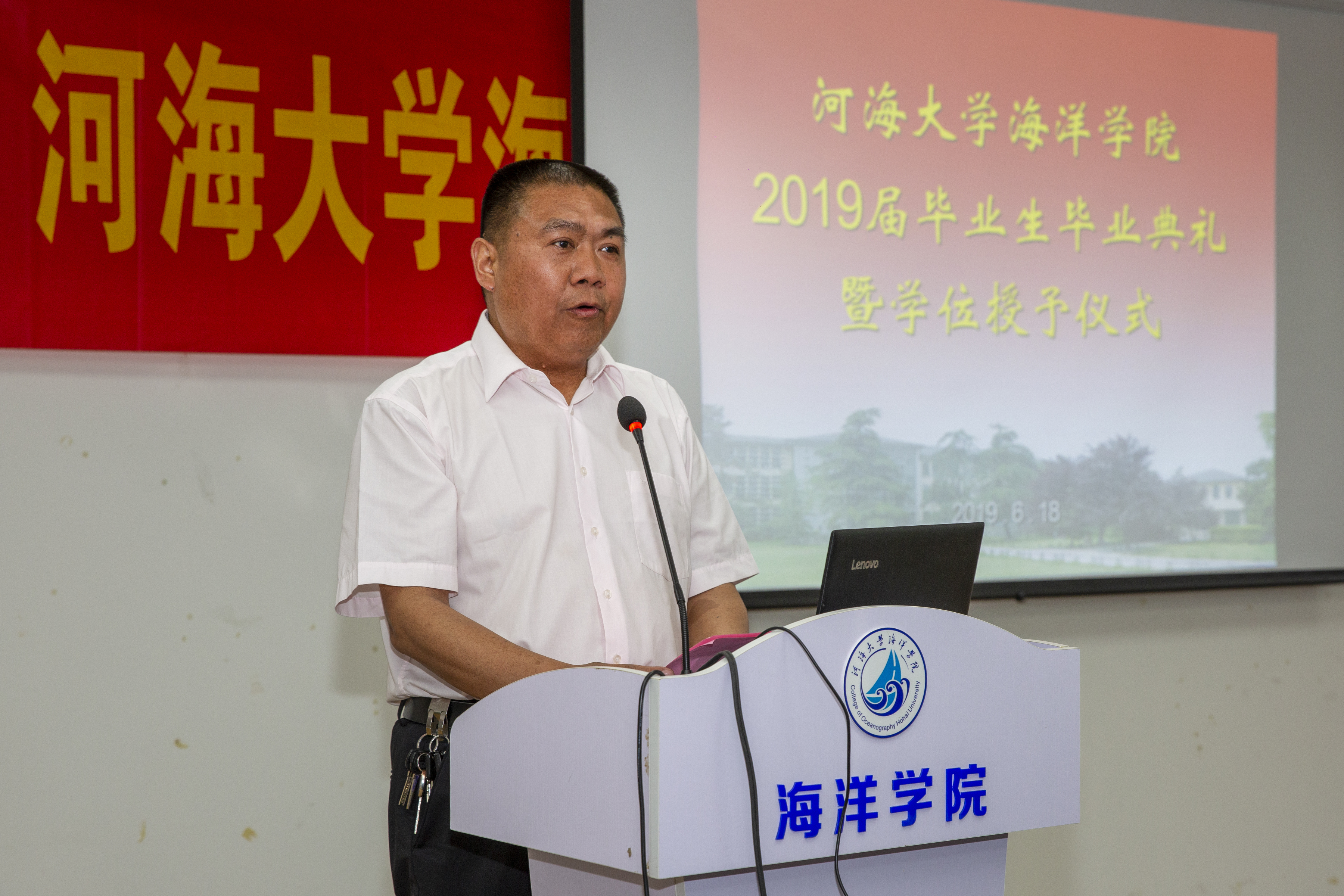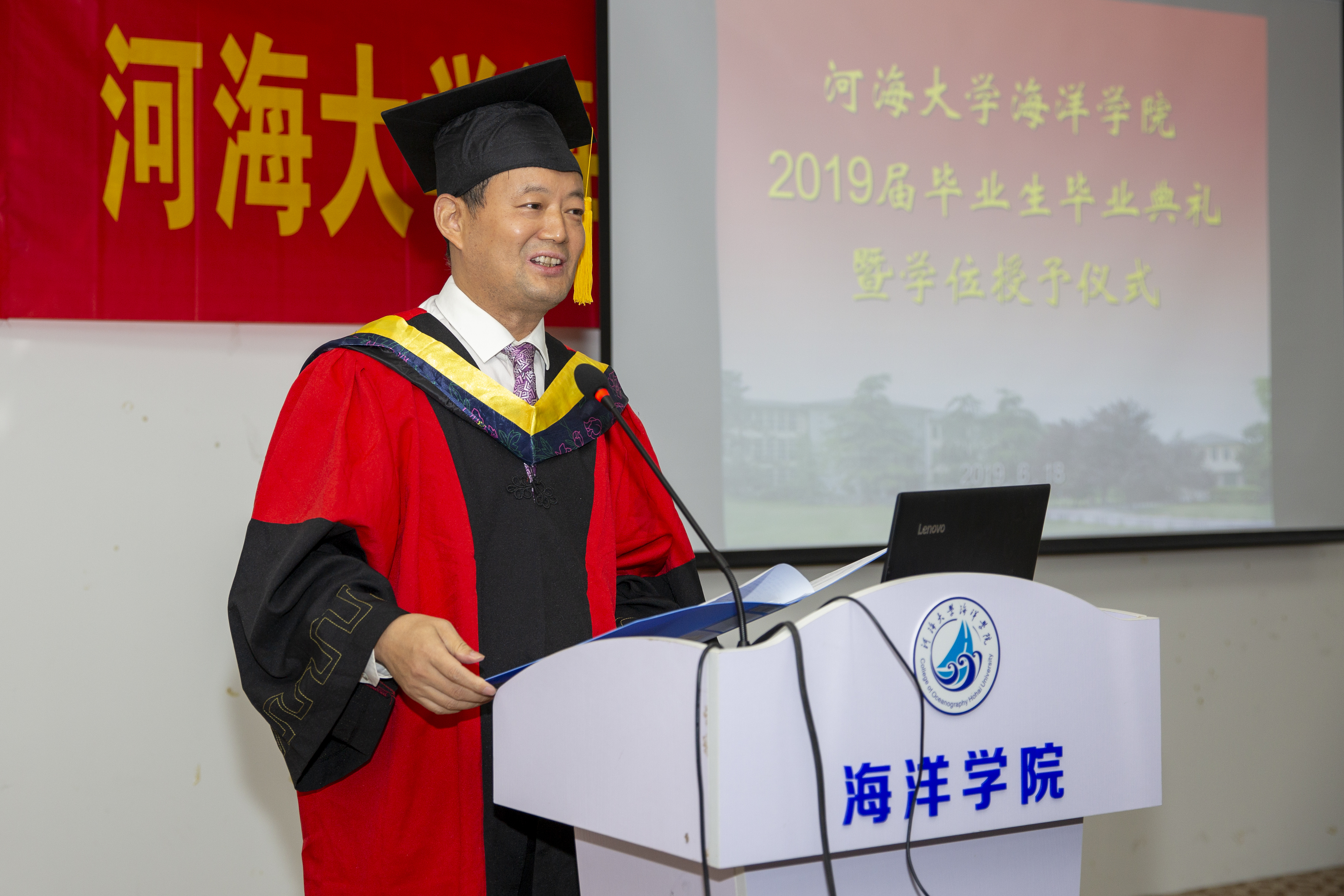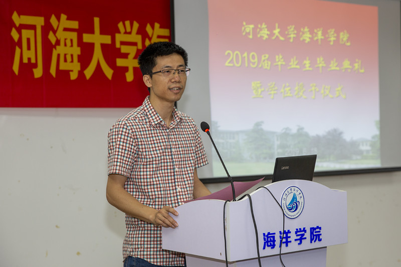 海洋院院长齐义泉教授作了题为《四年,我们一起走过,未来更加美好!》的典礼致辞,向各位毕业生同学表示热烈的祝贺,向为毕业生成长成才倾注无数心血的各位老师和家长致以崇高的敬意和诚挚的问候。齐院长说,四年来,我们教学相长,广大毕业生朝气蓬勃、奋发向上,谱写了自己人生中最华美的乐章,在挥洒青春精彩的同时,更为学院赢得众多荣耀。伴随着大家的成长,学院也乘着新时代的春风,取得了长足的发展。齐院长代表学院向毕业生送去深深的祝福。