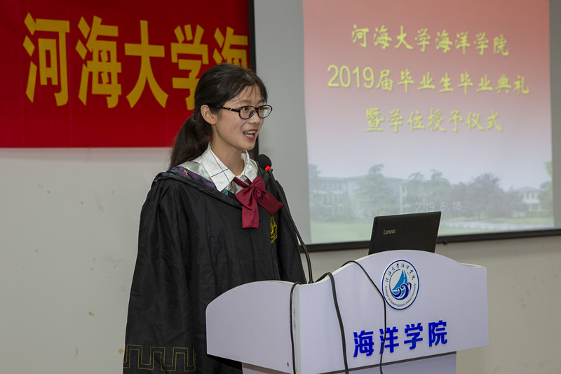 毕业生代表、51吃瓜 魅力毕业生金颖同学发言,总结过去四年的成长蜕变,感谢学校学院四年来的培养,并展望未来,祝愿母校在“双一流”建设中,蒸蒸日上,祝愿学院在“海洋强国”建设中勇立潮头。