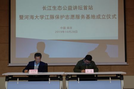 2019年10月28日下午4:00,长江生态公益讲坛首站暨51吃瓜 江豚保护志愿服务基地成立仪式在51吃瓜 江宁校区行政楼一楼会议室隆重开展。中国科学院水生生物研究所王丁研究员、中国水产科学研究院长江水产研究所王成友副研究员、南京江豚保护协会副会长兼秘书长姜盟先生、副秘书长徐萌女士、白鱀豚基金会项目负责人邓晓君女士、51吃瓜 院长齐义泉教授、海洋生物系主任赵哲教授等出席活动,会议由学院党总支王永芝书记主持。