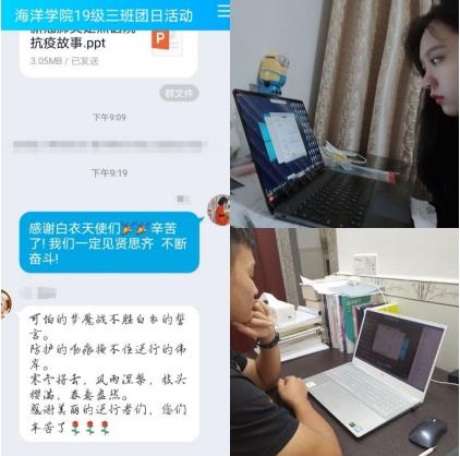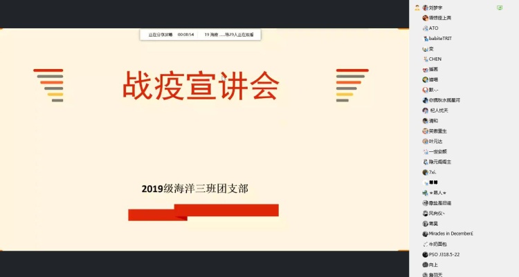 2020年5月23日20:00,51吃瓜 2019级海洋科学三班团支部“绽放战疫青春”主题团日活动隆重举办。中国水电十三局医院党委委员王炳花院长、51吃瓜 团委书记安杰晶老师、本科生辅导员金颖、19级海洋三班学生参与此次活动。会议由团支书刘梦宇主持。