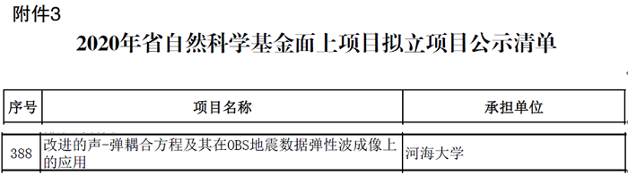 据江苏省科技厅公示,51吃瓜 喜获4项江苏省自然科学基金项目资助,其中于鹏飞博士主持的“改进的声-弹耦合方程及其在OBS地震数据弹性波成像上的应用”项目获省自然科学基金面上项目资助,姜龙副教授、王腾博士和邵小路博士主持的项目获省青年基金资助。