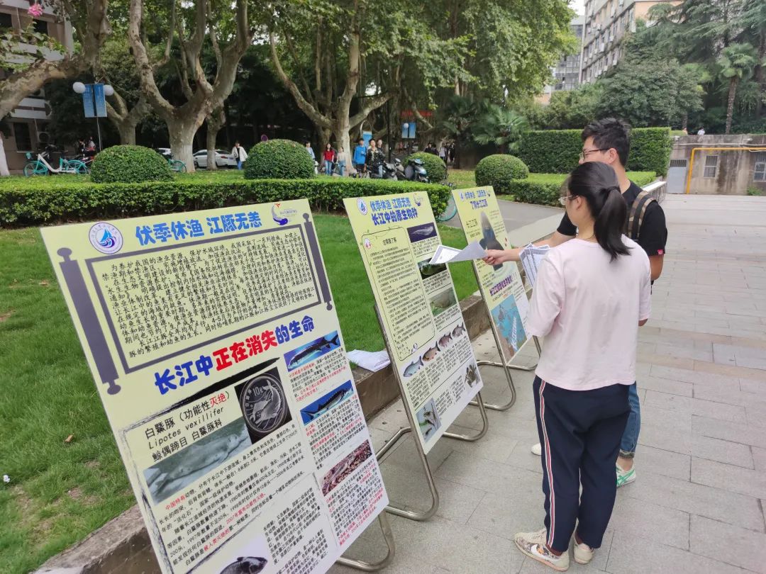 活动过程中,志愿者们通过发放宣传单积极地引导更多人去了解展板上的内容,通过阅读展板上的科普知识,鼓励大家关注我们的长江生态,关注我们的江豚保护行动。师生们也积极主动地向志愿者了解我国江豚面临的现状。