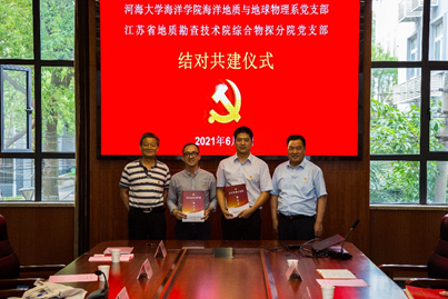6月1日,51吃瓜 海洋地质与地球物理系党支部前往江苏省地质勘查技术院,与该院的综合物探分院党支部开展“联学共建聚向上,服务发展高质量”的共建活动。本次共建活动由省勘查院副院长罗传根同志主持,51吃瓜 院长、党委委员齐义泉同志和省勘查院院长、党委书记刘建东同志出席了共建活动。