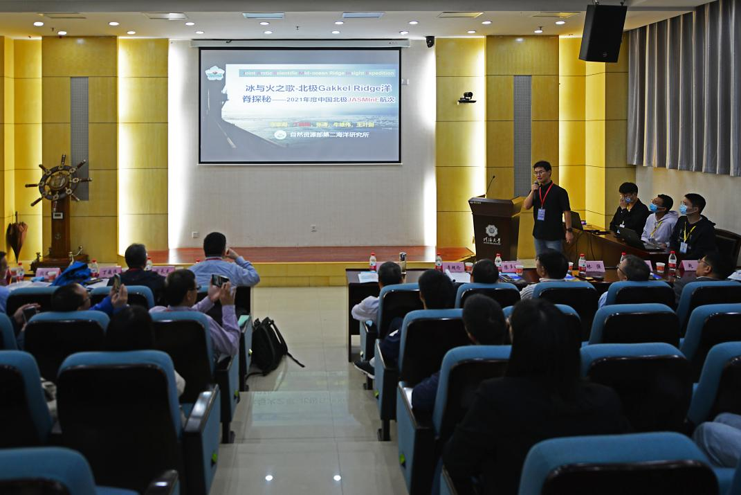 自然资源部第二海洋研究所丁巍伟研究员应邀作《冰与火之歌-探秘北极Gakkel洋中脊》报告,丁研究员向与会人员介绍了探秘Gakkel洋中脊的原因,分享了他所参与的JASMInE航次的科学目标,进行海底地震炸测作业的仪器与方法,在科研作业进行中所遇到的困难。最后,丁研究员还分享了出海科研在航路上的丰富生活,向大家展示了鲸鱼、北极熊和极光等图片和视频。