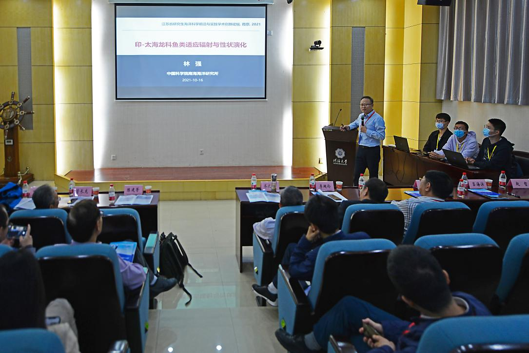 中国科学院南海海洋研究所林强研究员应邀作《印-太海龙科鱼类适应辐射与性状演化》报告,林强研究员从生命起源引入他的报告,表明了印-太海域是全球海洋生物多样性中心、但不一定是种化中心的观点,提出了海洋物种多样性形成机制、扩散与适应辐射模式等问题。随后,林强研究员以海龙科鱼类为例,讲述了其多样性的形成、演化和遗传机理,分别从印-太海域向西到印度洋海域,向南到南澳海域,向北到中国沿海区域进行了海龙科生物的外形和生态适应性的讲解,同时分析了海龙科鱼类伴随生态位分化产生的本地适应性。同科生物在不同海域却有截然不同的身体形态构造引起了与会专家和研究生的广泛讨论。