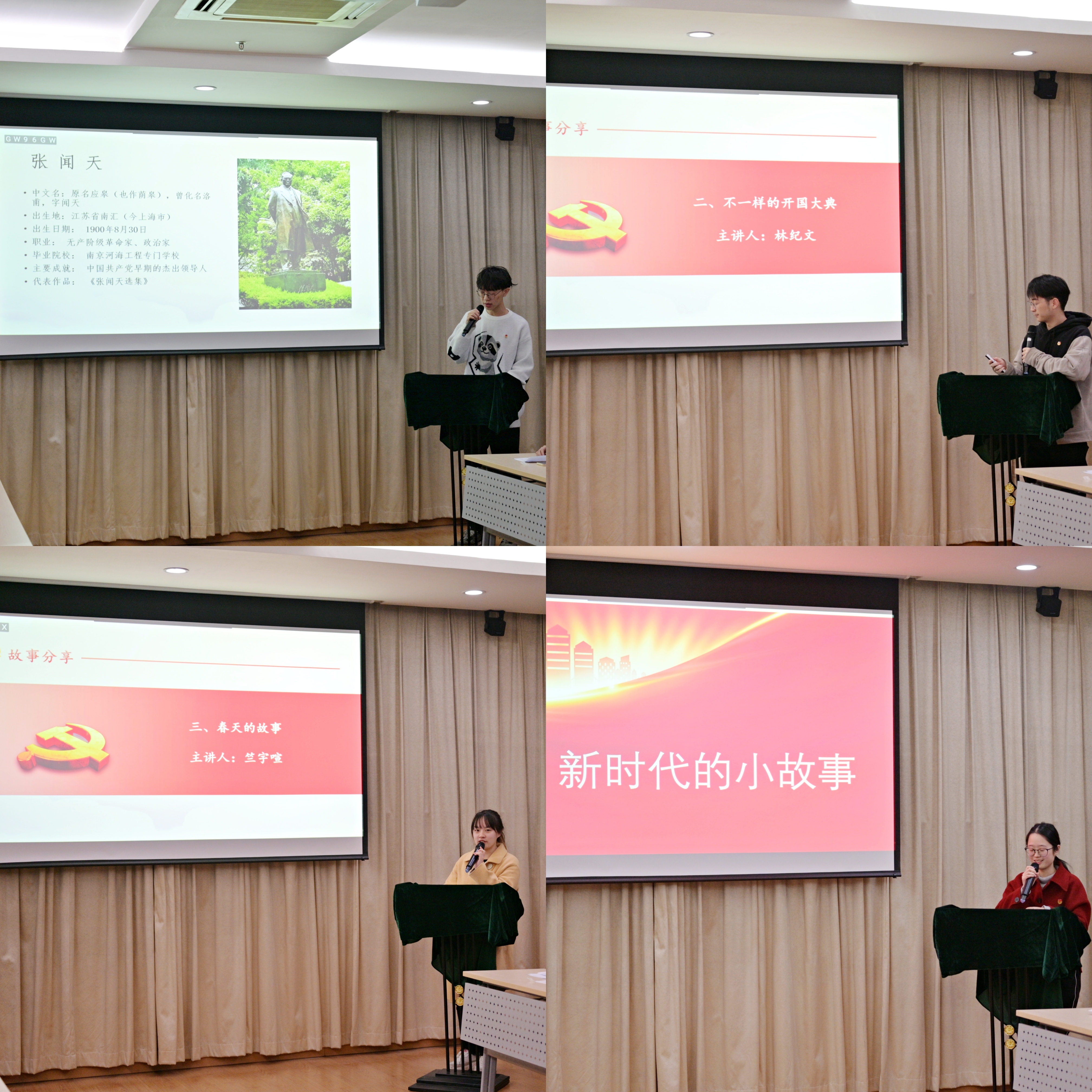 故事学党史环节,四位学生代表分别通过“红漫于心的校友张闻天”“不一般的开国大典”“春天的故事”“新时代的小故事”几个故事展开,展现了中国共产党带领全国各族人民为争取民族独立、人民解放和实现国家富强、人民幸福而不懈奋斗的光辉历程。