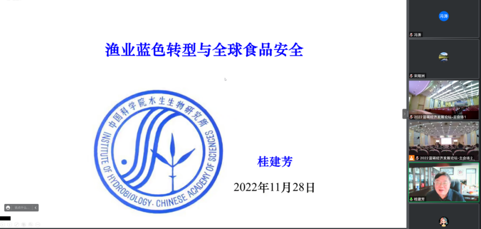 中国科学院水生生物研究所桂建芳院士为大会作《蓝色转型与全球食品安全》特邀报告。桂院士从中国古代的水产养殖开始讲起,介绍了我国由传统养殖产业向现代养殖产业的转型,详述了水产养殖发展的中国智慧以及对世界所造成的重要影响。桂院士指出,我国需要进一步积极推动渔业生产从捕捞向水产养殖转型,保证水产食品的可持续生产和水生生境与生物多样性,对全球食品的安全做出重要贡献。