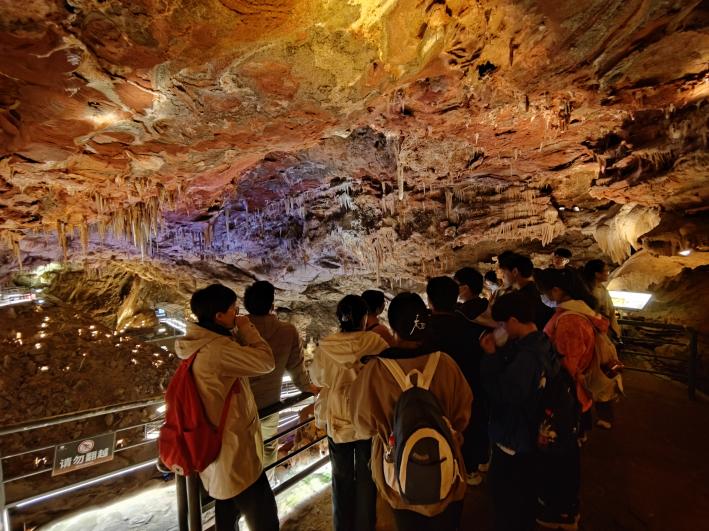 11月13日清晨,同学们再次出发,前往南京汤山方山国家地质公园博物馆,探索“地层天书”和“人类密码”的奥秘。场馆内,吴琼老师首先为大家介绍了该博物馆的建设历史以及南京猿人洞发现的过程,让同学们对六亿年以来的地球生命及地质的演变演化过程充满了好奇。琳琅的化石展品以及花式的视频图片讲解,以及沉浸式的游戏互动,同学们在体验探索式参观模式下,了解和感悟地球历史中那些漫长而丰富的生命与地质演变。随后大家移步猿人洞风景区,瑰丽的溶洞,形态各异的钟乳石,都蕴含着各种地质知识点。吴琼老师为同学们详细讲解了钟乳石的形成机制及钟乳石中氧同位素在古气候研究中的重要意义,拓宽了同学们的科学视野。