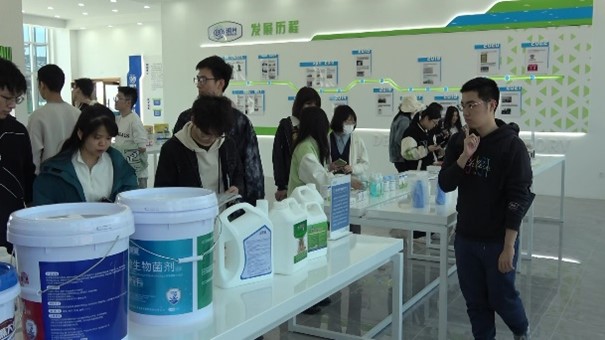 在参观过程中,工作人员主要为同学们介绍了运用泡叶藻生产食品级海藻酸钠的工艺流程以及生产过程中一些设施的技术细节,同学们就其中的生产过程提出了疑惑并得到了耐心解答。随后,同学们在展览馆参观了明月海藻集团的发展历程及其上市产品,了解到海藻中提取出的成分已经应用于生产生活各个方面,从美妆产品到医用敷料,从农业化肥到宠物饲料,海藻因其高保湿、高纤维、营养丰富、绿色环保等特点受到广泛关注,同学们从中发现了海洋经济发展的巨大潜力,激发了科研探索的极大兴趣。