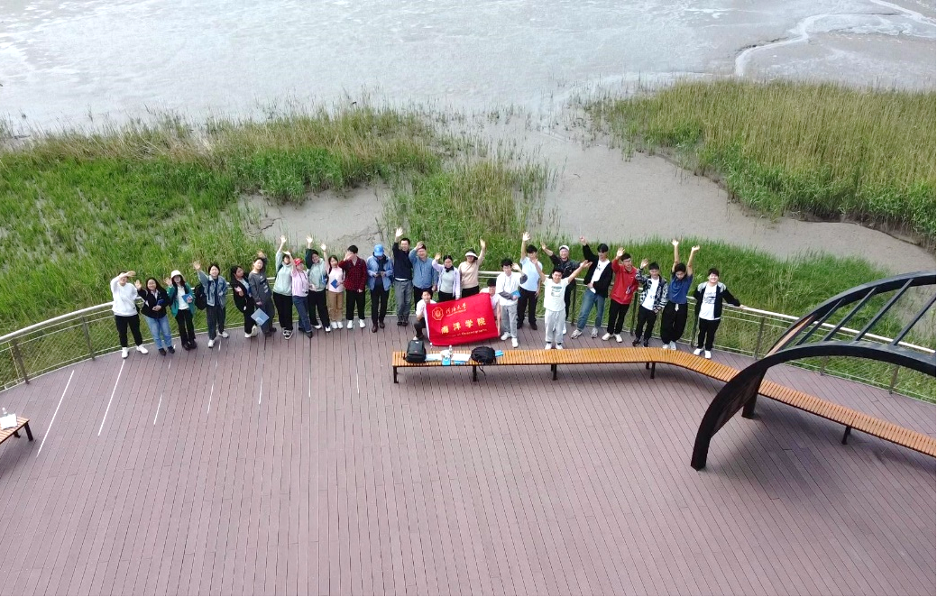 4月26日,同学们抵达上海崇明岛的西沙国家湿地公园。初入湿地,弯曲绵延的木栈道延伸进郁郁葱葱的水杉,恍惚间仿佛进入迷雾森林。在这里,同学们观察并认识了潮控三角洲的样貌形态,掌握了潮坪沉积的一系列地质特征。在绝美自然风光的西沙湿地中行走,沿途阳光明媚鸟语花香,丛林高长水道萦纡,海面浩渺麦田无垠,云海苍茫水天一色。同学们沿途观察到了独特的淤泥质海岸的潮滩地貌、绚丽的河口湿地景观以及典型的潮沟现象,对仅以文字形式存在于课本上的知识点有了更深刻的理解。