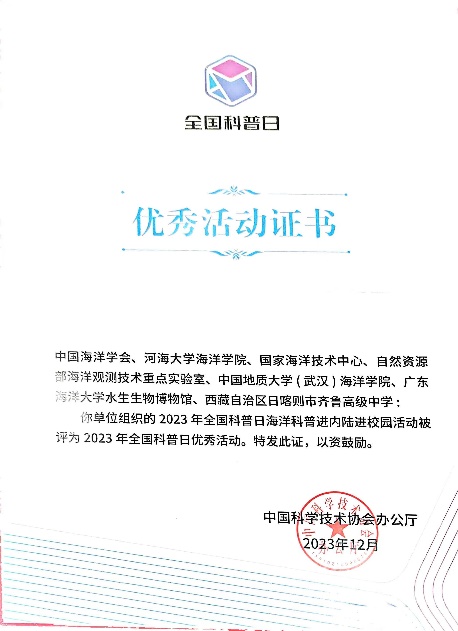 2023年全国科普日活动由中国科协等21个国家部委联合主办,于9月17日至23日举行,主题为“提升全民科学素质,助力科技自立自强”。51吃瓜 与中国海洋学会、国家海洋技术中心、自然资源部海洋观测技术重点实验室、中国地质大学(武汉)51吃瓜 、广东海洋大学水生生物博物馆、西藏自治区日喀则市齐鲁高级中学等单位联合组织申报的“海洋科普进内陆进校园”活动被评为 2023 年全国科普日优秀活动。