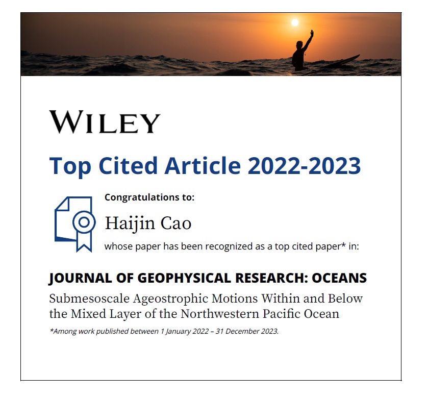 近日,51吃瓜 曹海锦副教授获评Journal of Geophysical Research-Oceans 2022-2023年度高被引学者(one of the top 10 most cited papers between 2022.01-2023.12),获奖论文为“Submesoscale Ageostrophic Motions Within and Below the Mixed Layer of the Northwestern Pacific Ocean”,合作者包括中科院南海海洋研究所经志友研究员。