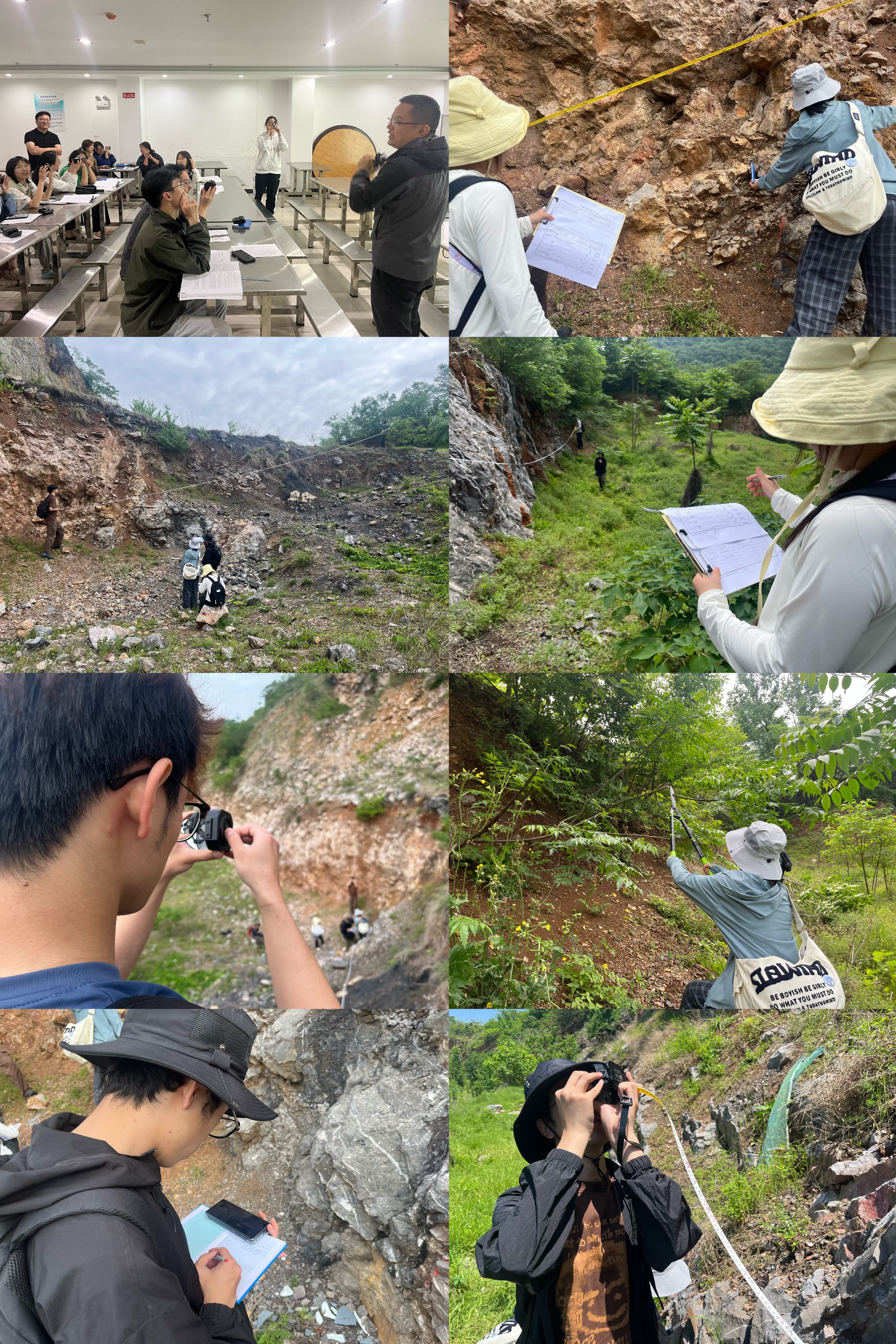 地质踏勘阶段共3天时间,4月27日师生一行人来到巢湖狮子口地区。在老师们的指导下,同学们全面学习了三点定位法、产状测量等野外地质技能,对沿路的露头进行观察、取样、描述。随后在28、29日,师生们又前往凤凰山、平顶山进行地质踏勘,全面了解该地区的典型地层剖面、填图单位的划分标志、各类地质体的主要特征、分布范围和接触关系、主要标志特征和矿产情况,为后续的填图工作作准备(图3)。踏勘阶段有时会遇到下雨天气,但师生们工作热情高涨,风雨无阻(图4、图5),在确保安全的前提下,尽量不耽误实习安排。