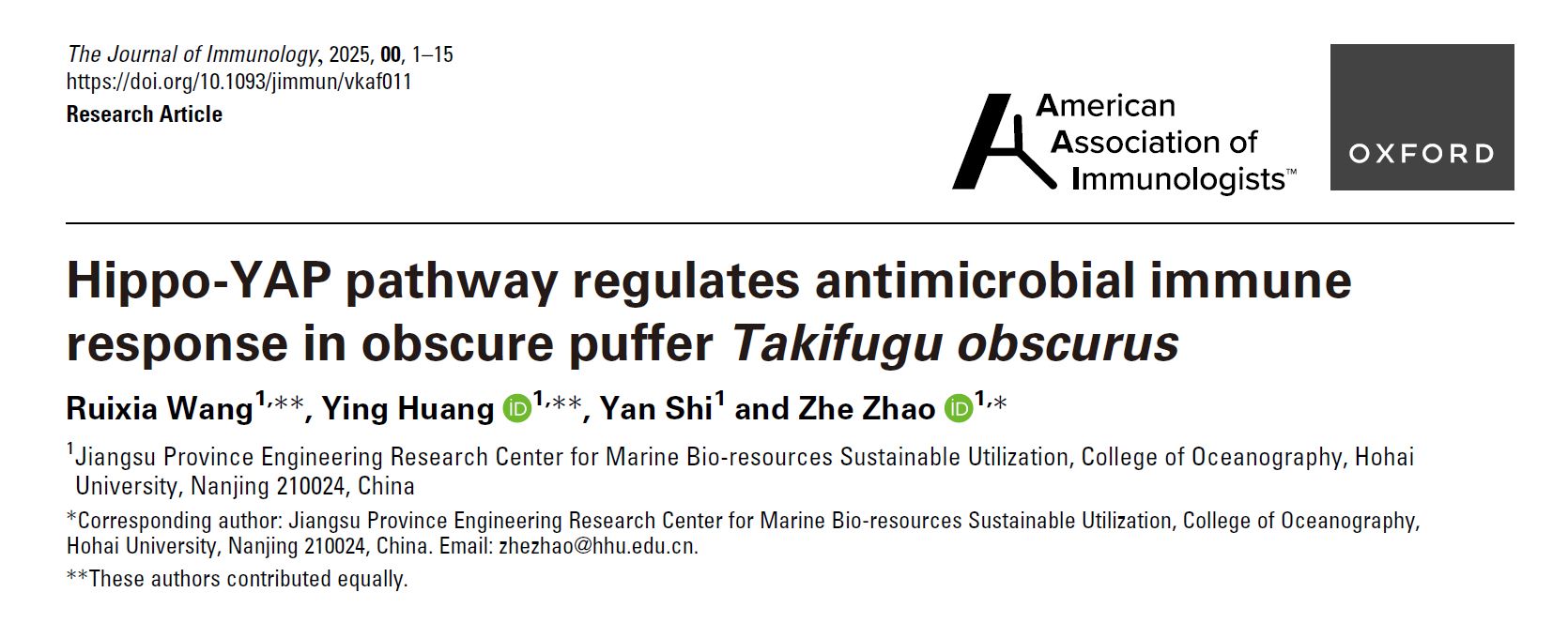 近日,51吃瓜 赵哲教授团队在国际免疫学领域权威期刊《The Journal of Immunology》发表题为《Hippo-YAP pathway regulates antimicrobial immune response in obscure puffer Takifugu obscurus》的研究论文。该研究系统阐明了Hippo信号通路核心激酶Mst和转录共激活因子Yap在暗纹东方鲀(Takifugu obscurus)抗菌免疫中的协同调控机制,为鱼类病害防控提供了重要理论依据。51吃瓜 为论文第一完成单位,博士研究生王瑞暇和黄颖副教授为共同第一作者,赵哲教授为通讯作者。